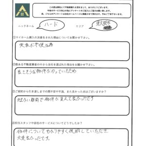 マイホーム購入の決意された理由についてお聞かせ下さい。 実家が不便な為。 数ある不動産業者の中から当社を選ばれた理由をお聞かせください。 良さそうな物件がのっていたため。 ご契約から引き渡しまでの間、不安や不満また良かった点はございますか? 短い期間で物件が変えて良かったです。 担当スタッフや会社のサービスについてどうでしたか? 物件についてわかりやすく説明していただき大変良かったです。 店舗からのコメント(担当者コメントなど) この度は、弊社にて不動産購入を頂きまして、誠にありがとうございます。 またお褒めのお言葉も頂き、大変嬉しく思います。 引き続き何かお困り事がございましたらお気軽にお声掛け下さい。 宜しくお願い致します。
