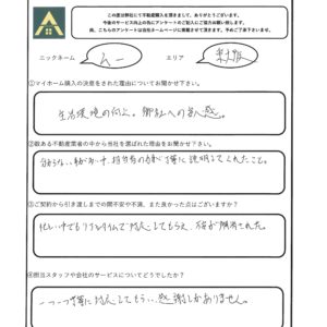 マイホーム購入の決意された理由についてお聞かせ下さい。 生活環境の向上。御社への安心感。 数ある不動産業者の中から当社を選ばれた理由をお聞かせください。 分からない事が多い中、担当者の方が丁寧に説明してくれたこと。 ご契約から引き渡しまでの間、不安や不満また良かった点はございますか? 忙しい中でもリアルタイムで対応してもらえ、不安が解消された。 担当スタッフや会社のサービスについてどうでしたか? 一つ一つ丁寧に対応してもらい、感謝しかありません。 店舗からのコメント(担当者コメントなど) この度は、弊社にて不動産購入頂きまして、誠にありがとうございます。 またお褒めのお言葉も頂き、大変嬉しく思います。 ムー様にはお仕事でお忙しい中にも関わらず書類のご準備など 迅速にご対応頂き、大変助かりました。ありがとうございます。 また、ご決済までご不安な点などもあったかとは思いますが、 その都度ご説明させて頂き、ご納得頂いた上で進めて頂けて良かったです ^^) また引き続きリフォームでお世話になりますが 今後とも宜しくお願い致します。