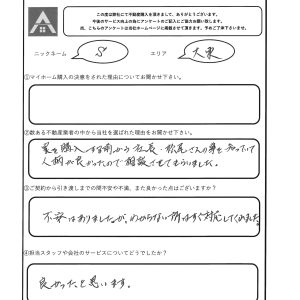 数ある不動産業者の中から当社を選ばれた理由をお聞かせください。 家を購入する前から社長、松尾さんの事を知っていて人柄も良かったので相談させてもらいました。 ご契約から引き渡しまでの間、不安や不満また良かった点はございますか? 不安はありましたが、分からない所はすぐに対応してくれました。 担当スタッフや会社のサービスについてどうでしたか? 良かったと思います。 店舗からのコメント(担当者コメントなど) この度は、弊社にて不動産購入頂きまして、誠にありがとうございます。 またお褒めのお言葉も頂き、大変嬉しく思います。 これからリフォームやお引越しでお忙しくされるかとは思いますが、 また何かございましたらお気軽にお声がけ下さいませ。 引き続き、宜しくお願い致します。