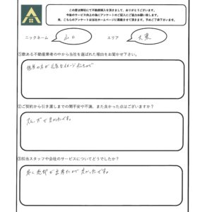 数ある不動産業者の中から当社を選ばれた理由をお聞かせください。 担当の方が元気なイメージだったので。 ご契約から引き渡しまでの間、不安や不満また良かった点はございますか? スムーズで良かったです。 担当スタッフや会社のサービスについてどうでしたか? 早く売却が出来たので良かったです。 店舗からのコメント(担当者コメントなど) この度は不動産のご売却おめでとうございます。 またお褒めのお言葉も頂き、大変嬉しく思います。ありがとうございます! これからもお困りごとやご相談ごとがございましたらお気軽にお問い合わせください。 引き続き、宜しくお願い致します。