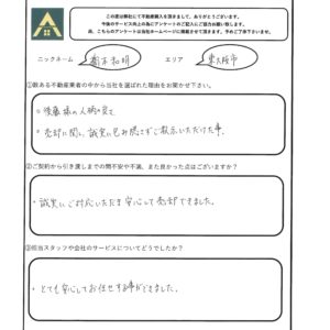 数ある不動産業者の中から当社を選ばれた理由をお聞かせください。 ・後藤様の人柄の良さ。 ・売却に関し、誠実に包み隠さずご教示いただけたこと。 ご契約から引き渡しまでの間、不安や不満また良かった点はございますか? ・誠実にご対応いただき、安心して売却できました。 担当スタッフや会社のサービスについてどうでしたか? とても安心してお任せする事ができました。 店舗からのコメント(担当者コメントなど) この度は不動産のご売却おめでとうございます。 またお褒めの言葉を沢山頂き、大変嬉しく思います。ありがとうございます! 私どもは誠実にお客様と向き合いながらお力になれるように努めております。 橋本様に信頼して任せていただけて、またご期待に添えることができ良かったです! これからもお困りごとやご相談ごとがございましたらお気軽にお問い合わせください。 引き続き、宜しくお願い致します。