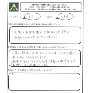 数ある不動産業者の中から当社を選ばれた理由をお聞かせください。 近隣での売却実績が多数おありで早急に売却したかったのでお任せしました。 ご契約から引き渡しまでの間、不安や不満また良かった点はございますか? 丁寧な説明と迅速な対応で一度も不安や不満に思った事はございませんでした。 担当スタッフや会社のサービスについてどうでしたか? 売却後の家のメンテナンスや引越し業者の手配等、安心してお願いできて感謝しています。 店舗からのコメント(担当者コメントなど) この度はご所有不動産のご売却、誠におめでとうございます。 またお褒めのお言葉もたくさん頂き、大変嬉しく思います! まる様のご期待に添えることができ、良かったです! また何かお困り事などございましたらお気軽にご連絡下さい!