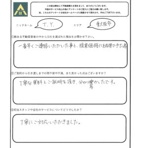 数ある不動産業者の中から当社を選ばれた理由をお聞かせください。 一番早くご連絡いただいた事と、提案価格に納得できた事。 ご契約から引き渡しまでの間、不安や不満また良かった点はございますか? 丁寧な資料とご説明を頂き、分かり易かったです。 担当スタッフや会社のサービスについてどうでしたか? 丁寧にご対応いただきました。 店舗からのコメント(担当者コメントなど) この度は不動産のご売却おめでとうございます。 またお褒めのお言葉も頂き、大変嬉しく思います。ありがとうございます! これからもお困りごとやご相談ごとがございましたらお気軽にお問い合わせください。 引き続き、宜しくお願い致します。