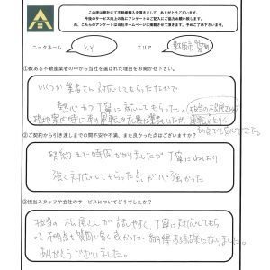 数ある不動産業者の中から当社を選ばれた理由をお聞かせください。 いくつか業者さん対応してもらったなかで熱心かつ丁寧に対応してもらった。 現地案内時に車の運転が乱暴な業者もいたが、担当の松尾さんは運転が上手く、その点でも安心できた。 ご契約から引き渡しまでの間、不安や不満また良かった点はございますか? 契約まで時間かかりましたが、丁寧にねばり強く対応してもらった点が心強かった。 担当スタッフや会社のサービスについてどうでしたか? 担当の松尾さんが話しやすく、丁寧に対応してもらって不明点も質問し易く良かった。 納得する結果になりました。ありがとうございました。 店舗からのコメント(担当者コメントなど) この度はご所有不動産のご売却、誠におめでとうございます。 またお褒めのお言葉もたくさん頂き、大変嬉しく思います! ご売却完了までお時間要してしまい、申し訳ございません。 ご売却完了までの期間、定期的にお打ち合わせのお時間を作って下さり ありがとうございました♪ 打ち合わせの中で色んなお話しをさせて頂き 私も楽しくお取引させて頂きました。 ありがとうございます。 また何かお困り事などございましたらお気軽にご連絡下さい!