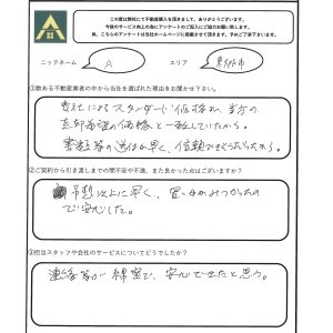数ある不動産業者の中から当社を選ばれた理由をお聞かせください。 貴社によるスタンダードが当方の売却希望の価格と一致していたから。 書類等の送付が早く、信頼できそうだったから。 ご契約から引き渡しまでの間、不安や不満また良かった点はございますか? 予想以上に早く、買い手が見つかったので安心した。 担当スタッフや会社のサービスについてどうでしたか? 連絡等が綿密で安心できたと思う。 店舗からのコメント(担当者コメントなど) この度はご所有不動産のご売却、誠におめでとうございます。 またお褒めのお言葉も頂き、大変嬉しく思います。 A様には遠方からにも関わらず、何度か足を運んで下さり、 書類等の準備も迅速に行って頂き、私もスムーズに取引させて頂きました。 ありがとうございました。 ご希望の金額でかつ、早いタイミングで お力になることができ、良かったです。 また何かございましたらお気軽にお声がけ下さいませ。 引き続き、宜しくお願い致します。